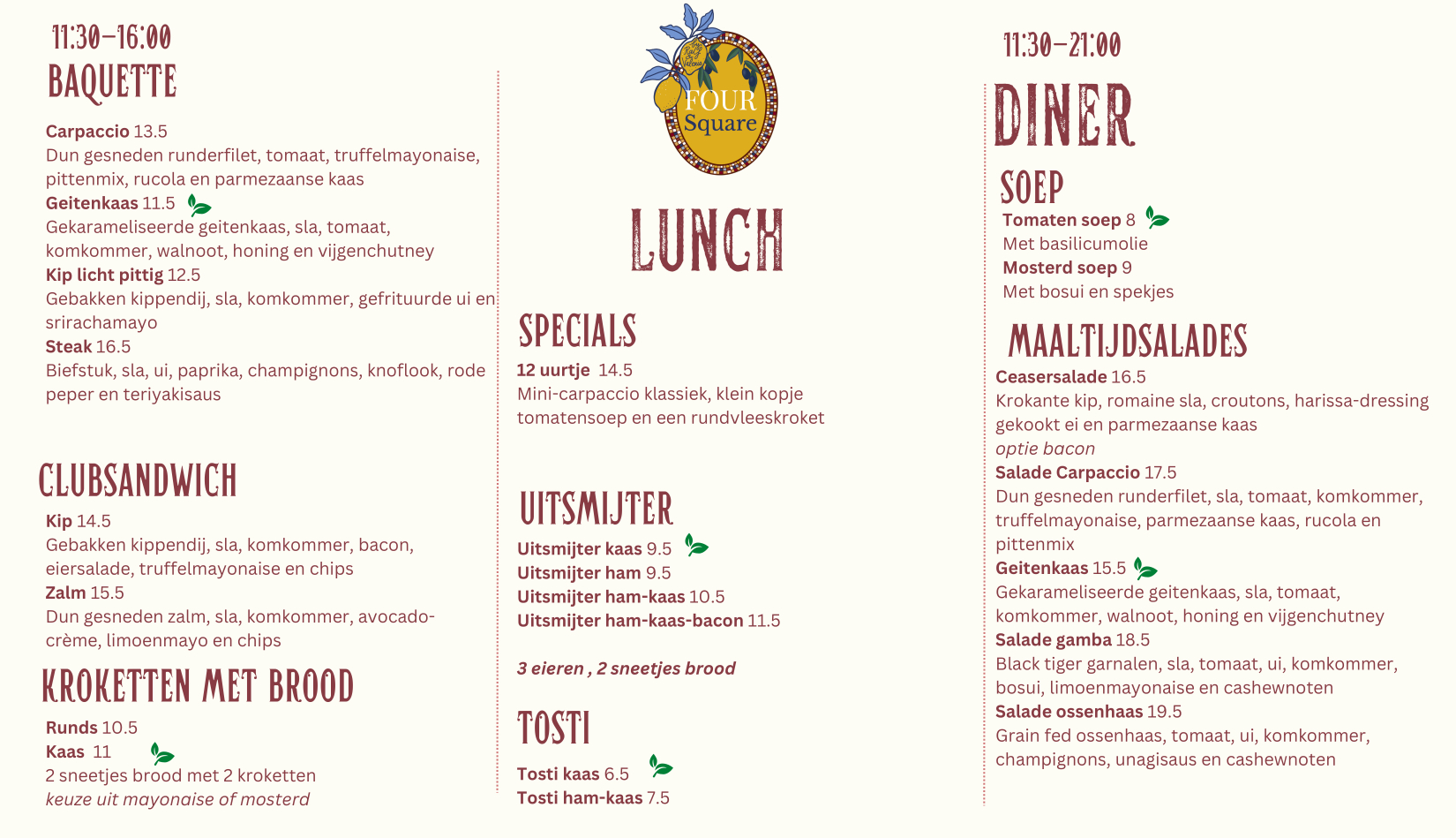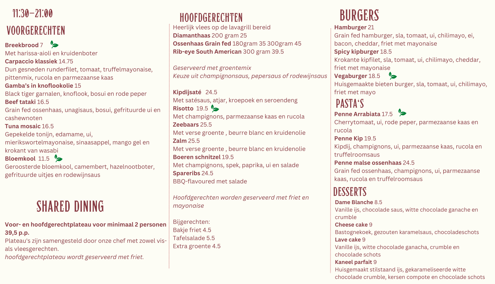 Onze keuken is elke dag geopend van 11:00 – 21:00 uur. Lunchen kan tussen 11.00 – 16.00 uur. Tevens hebben we heerlijke maaltijdsalades en ook voor een snelle hap kun je bij ons terecht.
